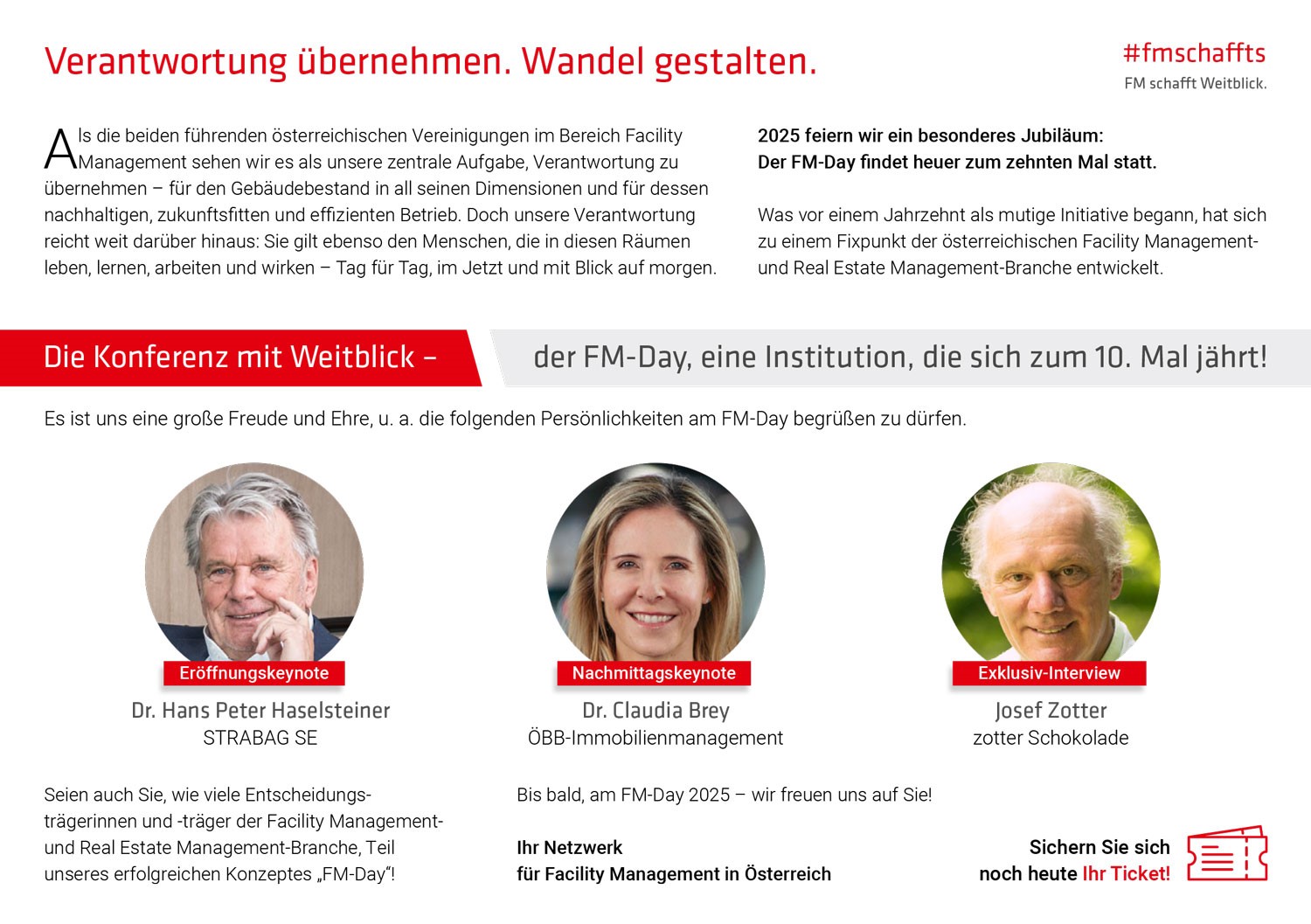 Als die beiden führenden österreichischen Vereinigungen im Bereich Facility Management sehen wir es als unsere zentrale Aufgabe, Verantwortung zu übernehmen – für den Gebäudebestand in all seinen Dimensionen und für dessen nachhaltigen, zukunftsfitten und effizienten Betrieb. Doch unsere Verantwortung reicht weit darüber hinaus: Sie gilt ebenso den Menschen, die in diesen Räumen leben, lernen, arbeiten und wirken – Tag für Tag, im Jetzt und mit Blick auf morgen.